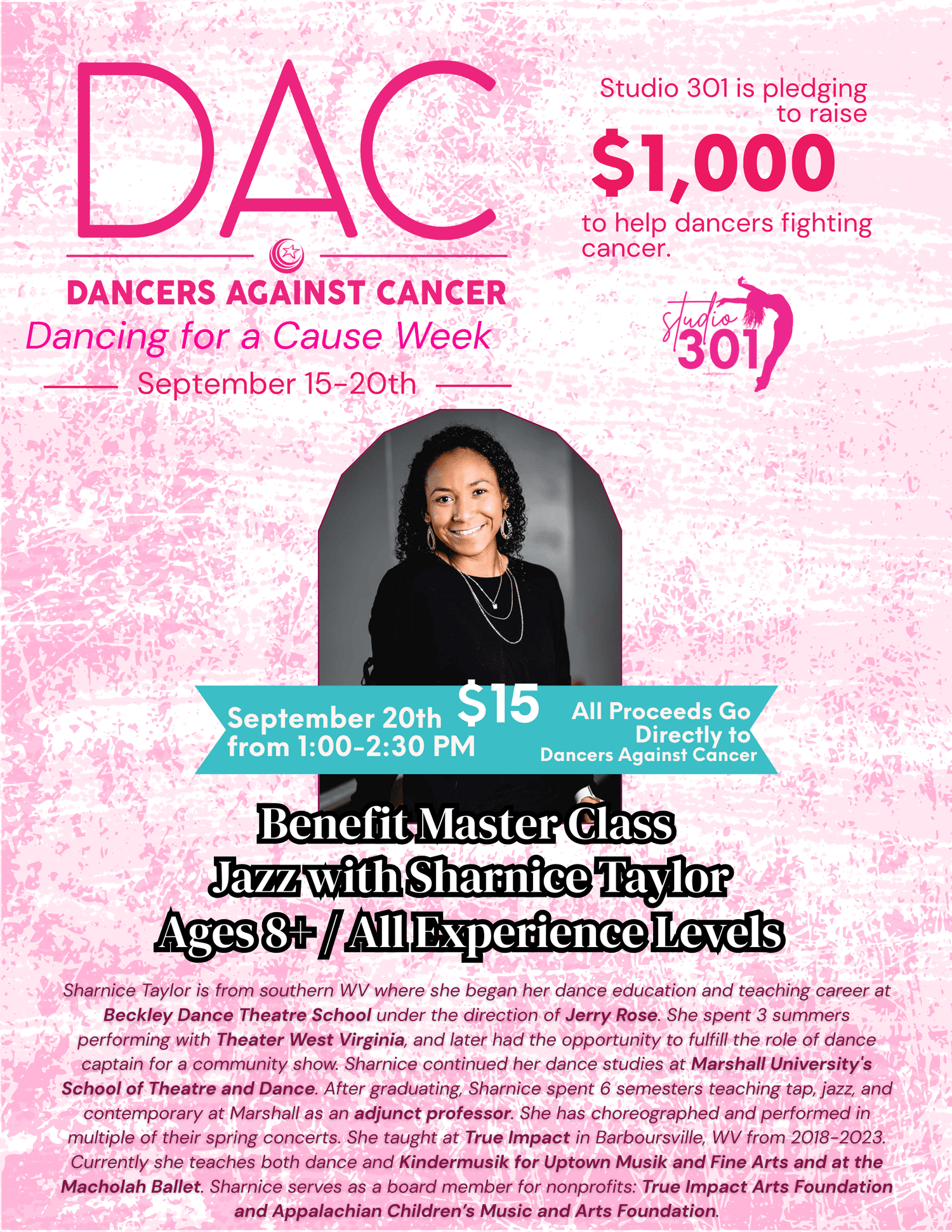 All proceeds go towards Studio 301’s fundraiser for Dancer’s Against Cancer.