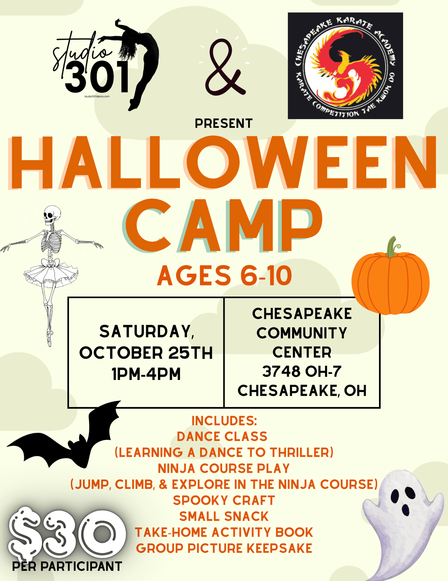 Studio 301 is partnering with the Chesapeake Karate Academy to host a THRILLING day camp, full of costumes, dancing, ninja courses, and FUN!