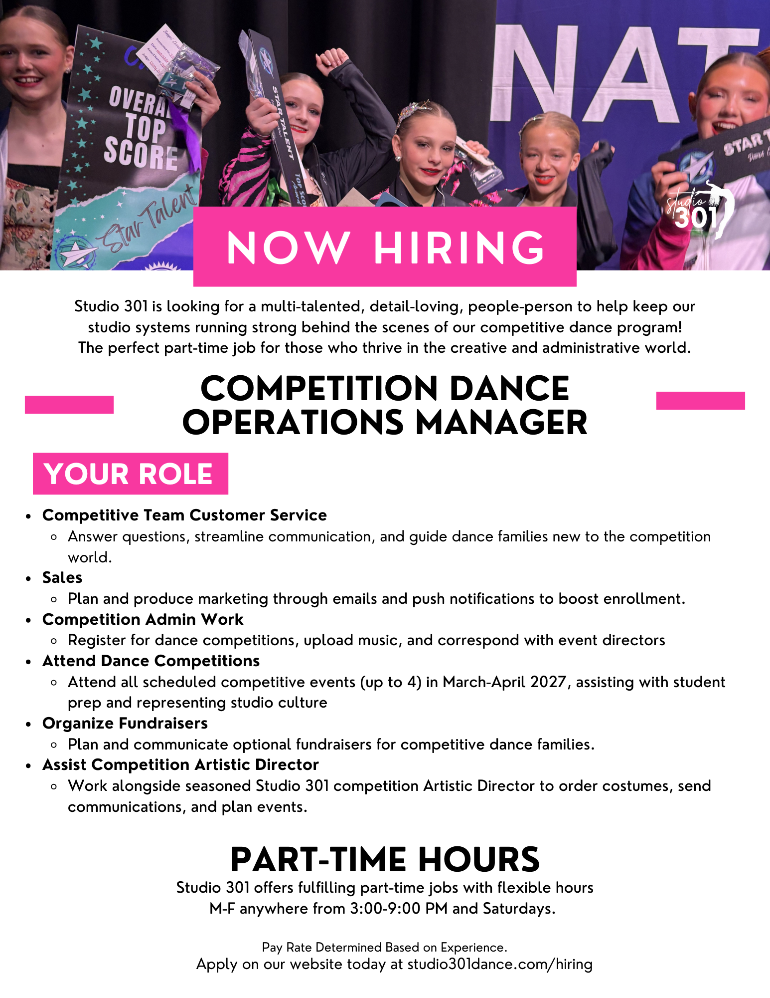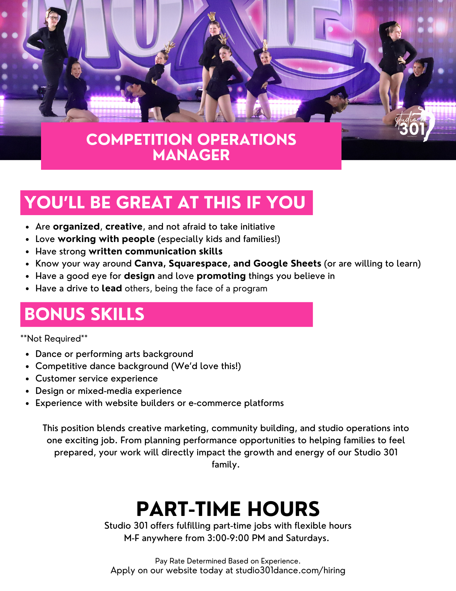 Join our ever-growing competitive dance team program as the head of admin operations.