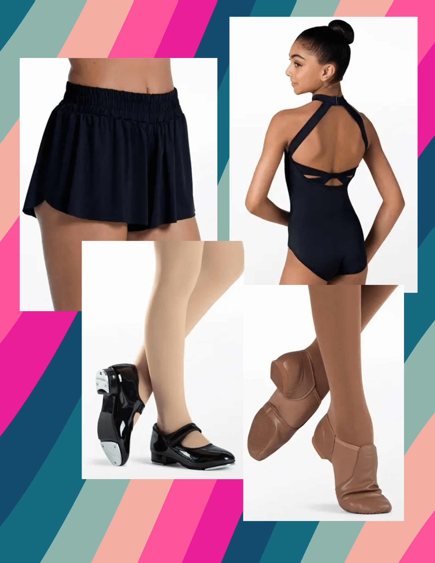 Includes jazz shoes, flowy shorts, and long sleeve mesh overshirt.